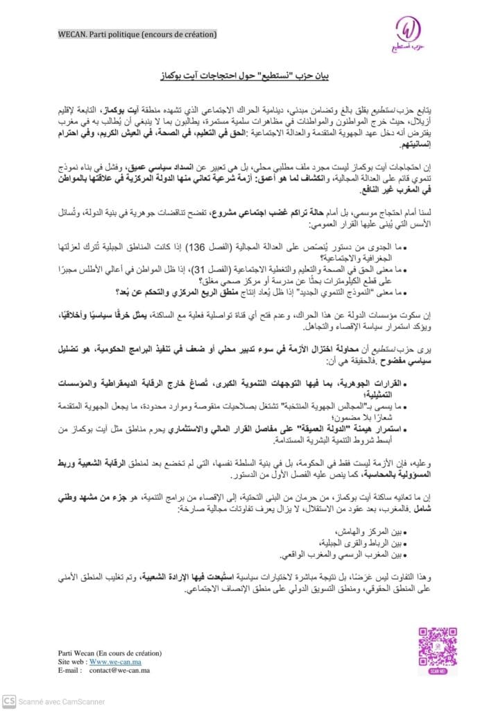 يتابع حزب نستطيع بقلق بالغ وتضامن مبدئي، دينامية الحراك الاجتماعي الذي تشهده منطقة آيت بوكماز، التابعة لإقليم أزيلال، حيث خرج المواطنون والمواطنات في مظاهرات سلمية مستمرة، يطالبون بما لا ينبغي أن يُطالب به في مغرب يفترض أنه دخل عهد الجهوية المتقدمة والعدالة الاجتماعية: الحق في التعليم، في الصحة، في العيش الكريم، وفي احترام إنسانيتهم.
