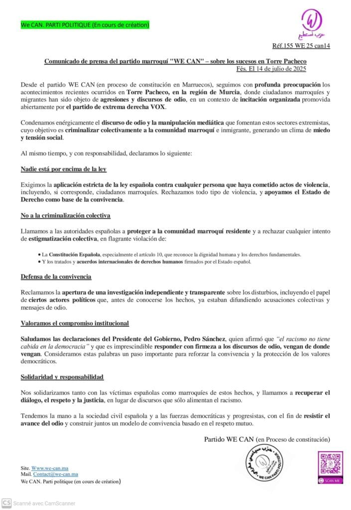 Desde el partido WE CAN (en proceso de constitución en Marruecos), seguimos con profunda preocupación los acontecimientos recientes ocurridos en Torre Pacheco, en la región de Murcia, donde ciudadanos marroquíes y migrantes han sido objeto de agresiones y discursos de odio, en un contexto de incitación organizada promovida abiertamente por el partido de extrema derecha VOX.